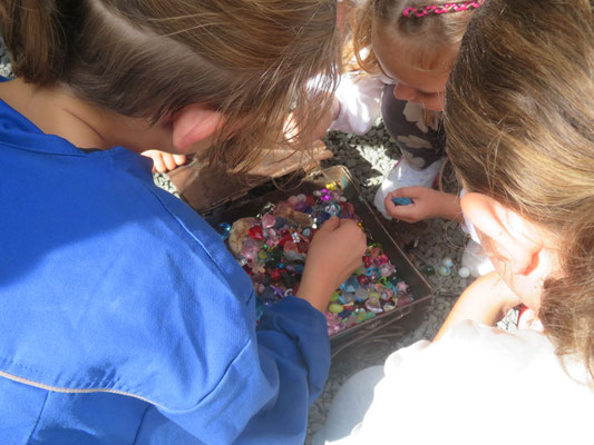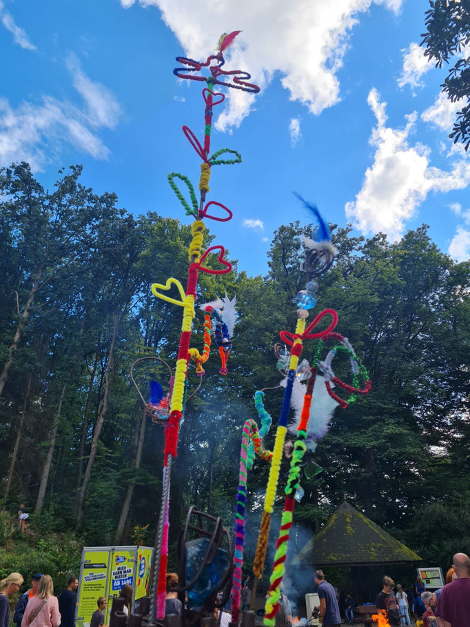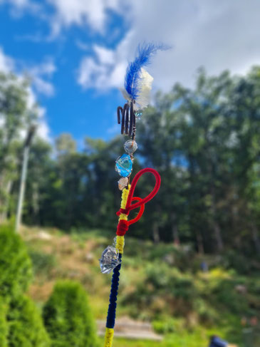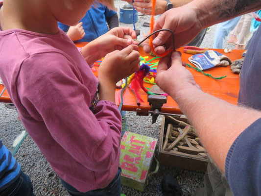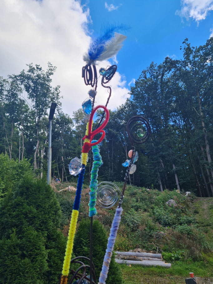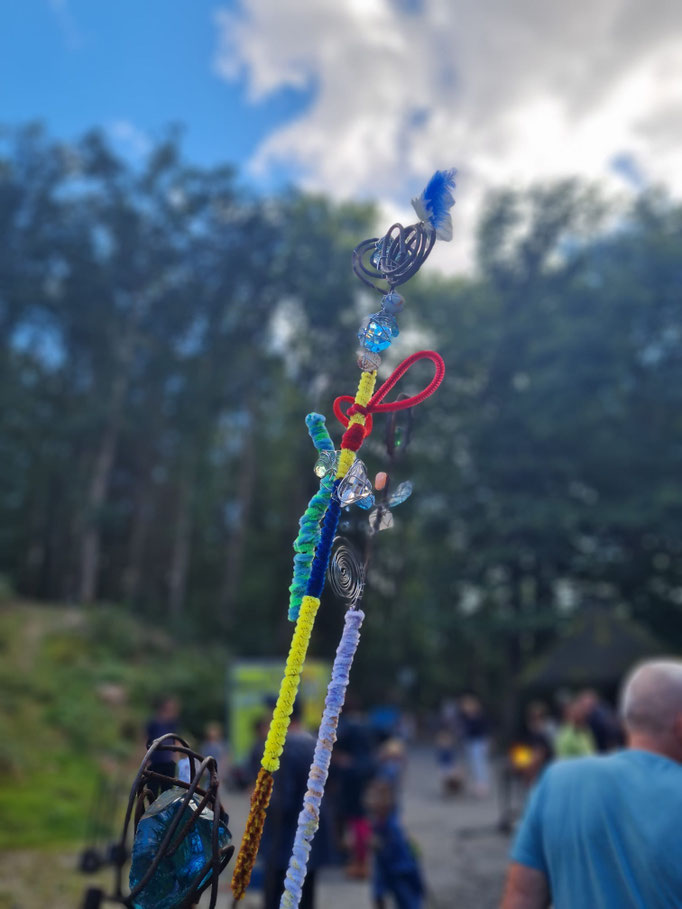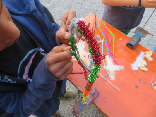 Aber damit nicht genug. Nach dem die Grundform erstellt worden war, ging es nun an die Verzierung des Zauberstabs. Nach Belieben wurden die Zauberstäbe mit Goldglanz, Fundstücken, Draht, Juwelen und vielem mehr geschmückt und verschönert. Mit großer Aufmerksamkeit und eigener Handarbeit vollendete jeder – Kind, Jugendlicher, Erwachsener – sein eigenes selbst geschaffenes Kunstwerk.