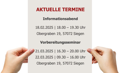 Haben wir Sie neugierig gemacht und Ihr Interesse geweckt? Dann freuen wir uns über Ihre Kontaktaufnahme und Ihren Besuch bei unserem nächsten Informationsabend am 18. Februar und über Ihre Teilnahme an unserem Vorbereitungsseminar am 21. und 22. März. Wenn Sie bis zum nächsten Informationsabend nicht warten wollen - kein Problem. Dann rufen Sie uns einfach an oder schreiben Sie uns eine E-Mail und wir vereinbaren mit Ihnen ein persönliches Kennenlern- und Informationsgespräch.